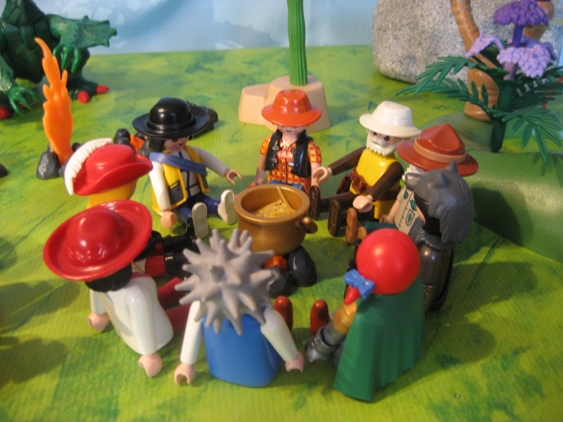 Schnell hatten sie einige Feuer angezündet, wobei Burny sich besonders freute, dass er mal wieder offiziell zündeln durfte. Große Töpfe fanden sich auch und die Reste des Proviants wurden aufgeteilt. Sie versammelten sie sich an den Lagerfeuern, wobei einige vermisst wurden.
