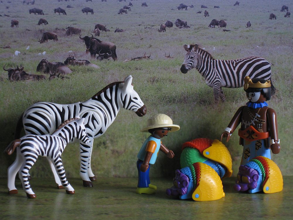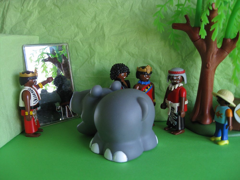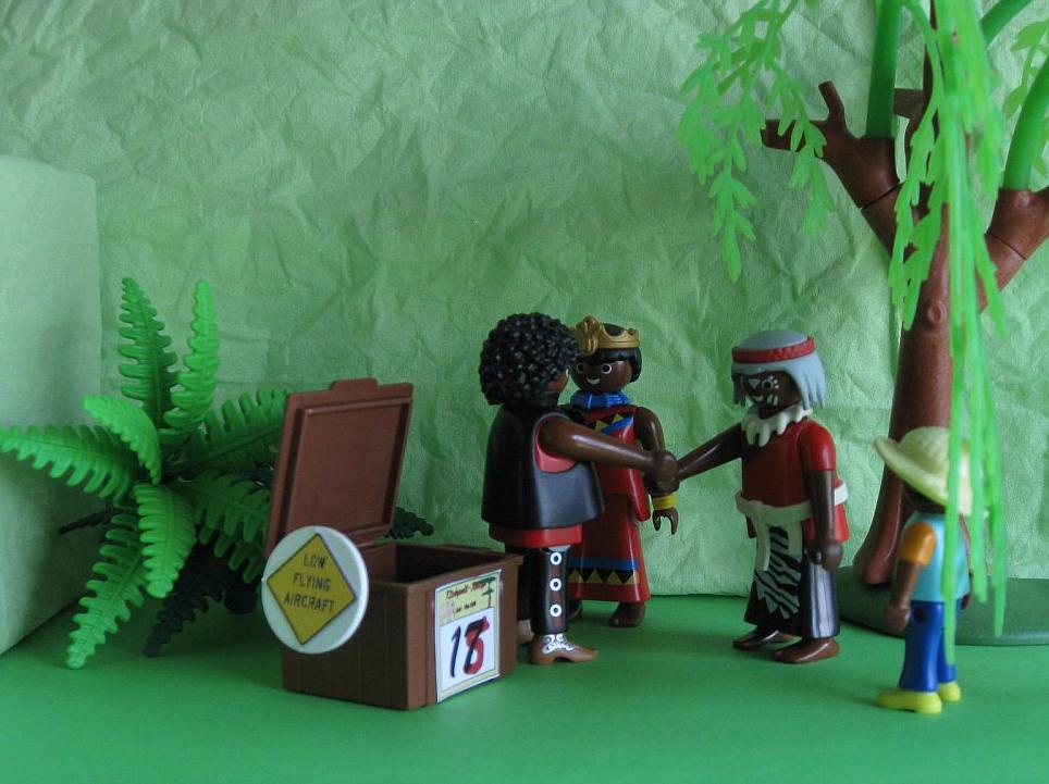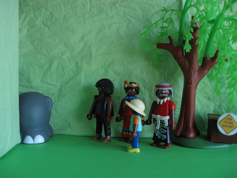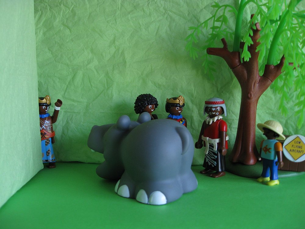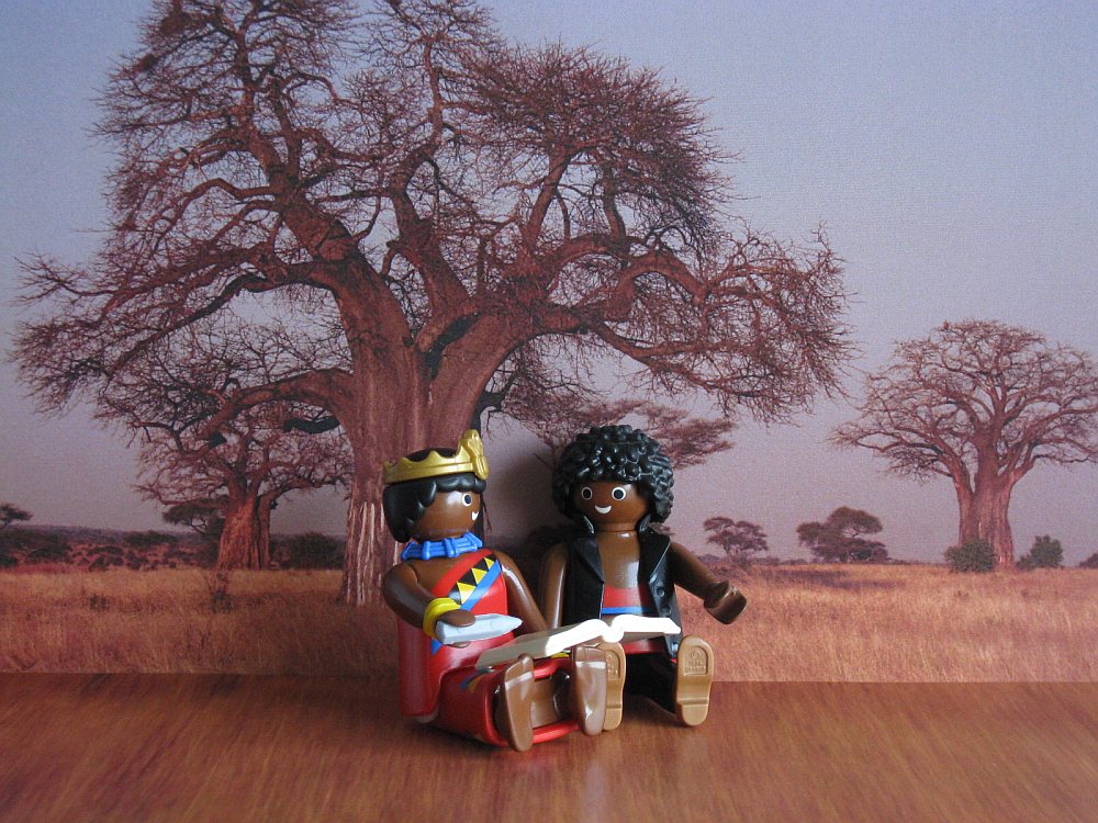 "Ah, Ramon und Usambara!" grüßt er, "Ich habe schon viel von euch gehört. Danke, dass ihr meine Kinder wohlbehalten hierher gebracht habt! Mein Name ist Umckaloabo, ich bin der Schaman- öööh, will sagen, ich bin der Tierarzt hier in der Gegend. Ja, genau. Nur der Tierarzt. Meine Praxis ist samstags nachmittags geschlossen, und da bin ich euch ein Stückchen entgegengekommen."