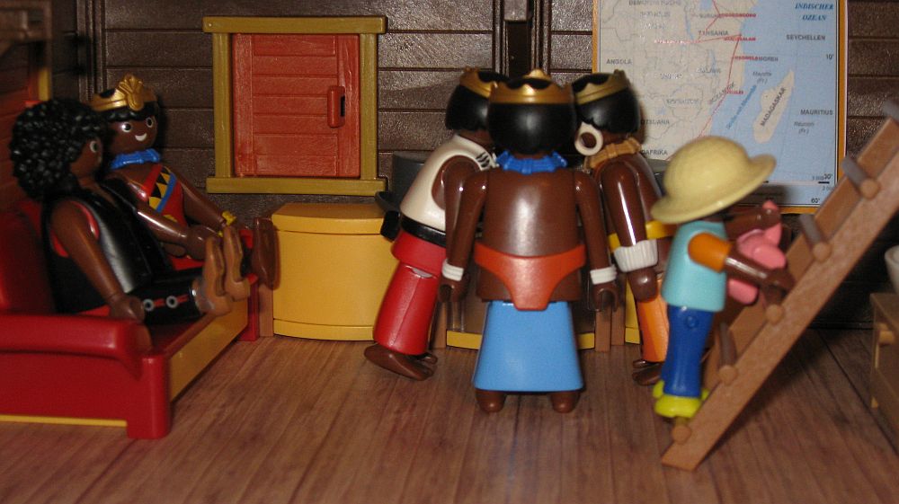 "Und ich müßte nicht ständig auf meine kleine Schwester aufpassen", ergänzt Olekundani, "stattdessen könnte ich mal auf deine kleine Schwester aufpassen, das wird bestimmt ein Riesenspaß!"