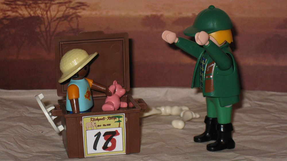 "Vier Masai, ein Nilpferdbaby", schnauft der Mann ganz außer Atem, "ich habe ihre Spuren bis vor diese blöde Kiste hier verfolgt!"