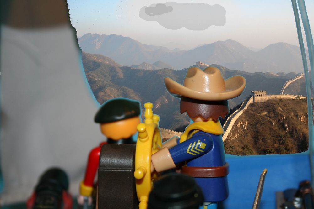 Ich: Ruhe ihr beiden! Da drüben ist die Mauer doch! Wenig später überflogen wir die große Mauer und in Richtung Peking