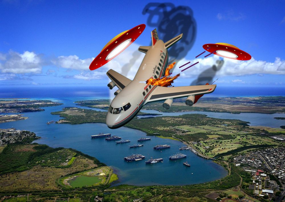 Das, dem Funk nach, letzte reguläre Linienflugzeug nach Hawaii wurde von den Aliens angegriffen und förmlich entzwei geteilt.