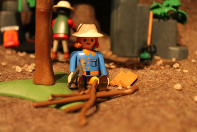 Peter hat Holz fürs Lagerfeuer gesammelt und zerkleinert es mit dem Beil.