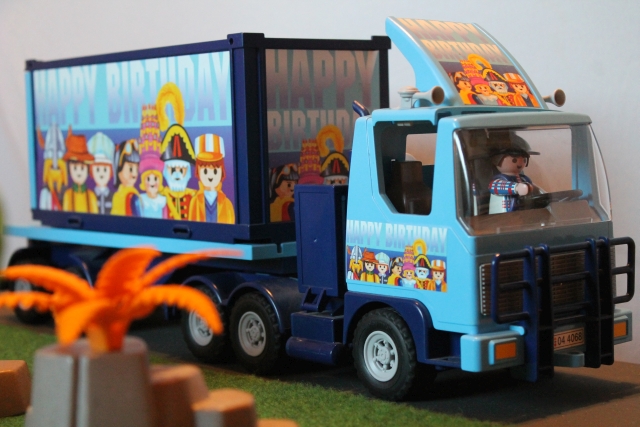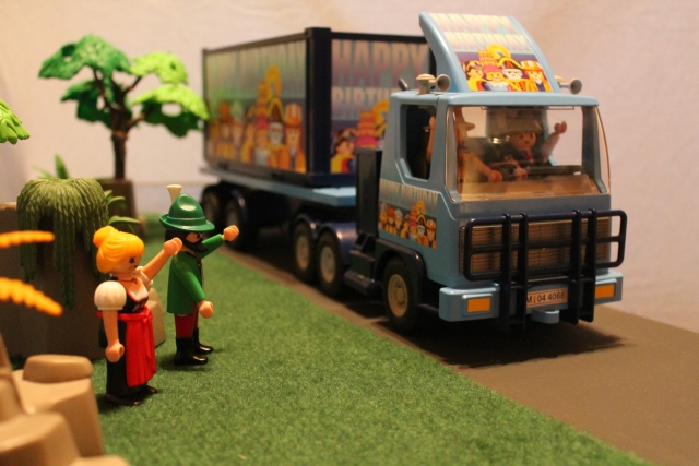 Da kommt auf der nahen Straße ein Sattelschlepper angefahren, hält an und hupt kurz.