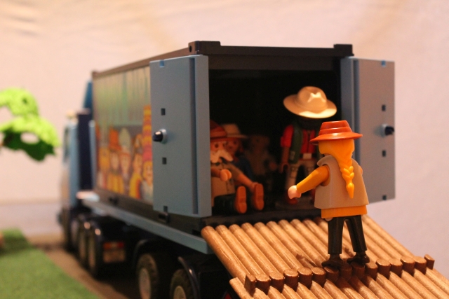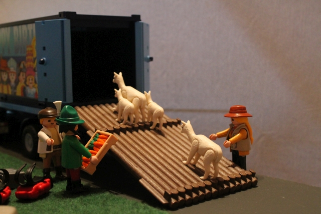 Stefan steht auf und geht zu dem Fahrer um mit Ihm alles zu klären. "Also wir haben 4 Alpakas, 6 Personen und ca 120 Kilo Gepäck. Alles klar Meister. Ich werde die Lauframpe auslegen dann können Sie mit dem einladen beginnen."
