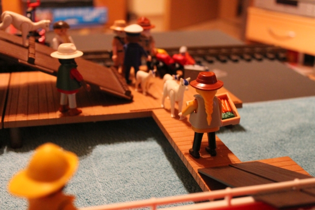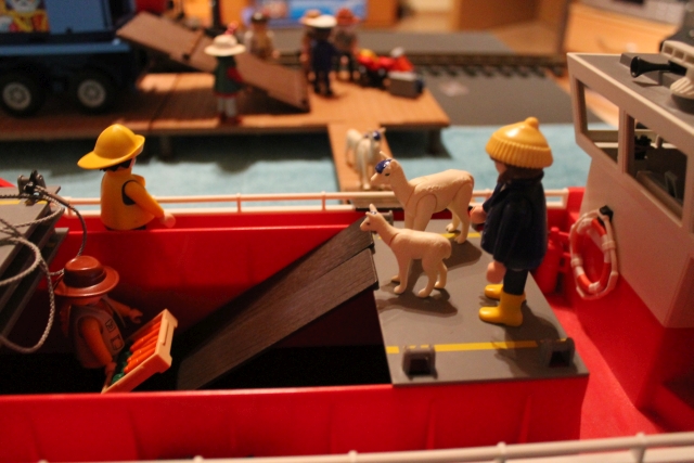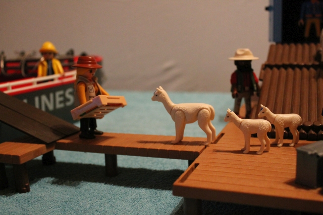 Sofort beginnen unsere Helden die wertvolle Fracht aufs Schiff zu verladen. Über einen Brettersteg aufs Schiff... ...und dann wieder über einen Steg nach unten in den Laderaum. "Mein Gott, ihr wollt auch für jeden schritt eine Möhre haben!" schimpft Christine, die die Tiere nach unten führt.