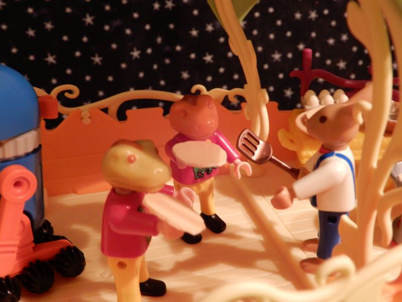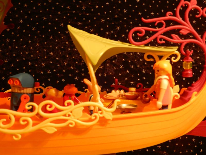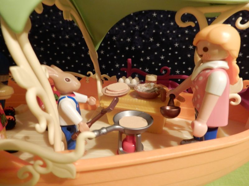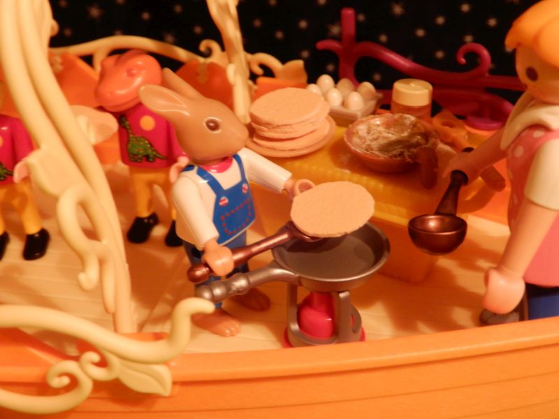 Während die anderen Pfannkuchen essen, sorgen Möhrchen und ich dafür, dass es genügend gibt... Aber trotzdem haben wir das Gefühl, dass der Stapel Eierkuchen schneller wächst, als wir backen. Es ist eben ein Feenschiff!