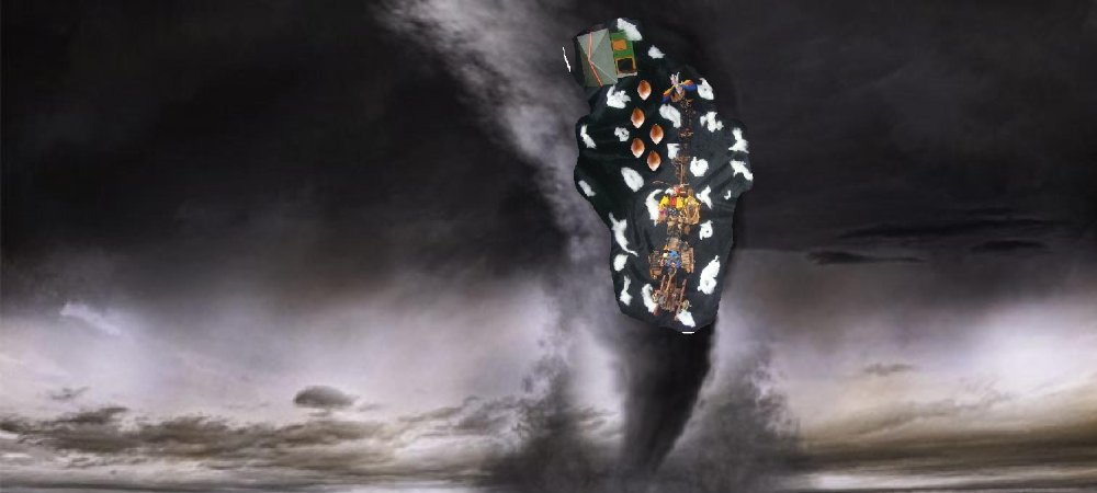 Feld 6: Ein Tornado reißt Dich hoch in die Luft! Aus einem vorbeifliegenden Farmhaus fallen Dir 2 Zauberzwiebeln direkt in die Tasche. Alles gut festhalten, der Tornado zieht auf FELD 7!