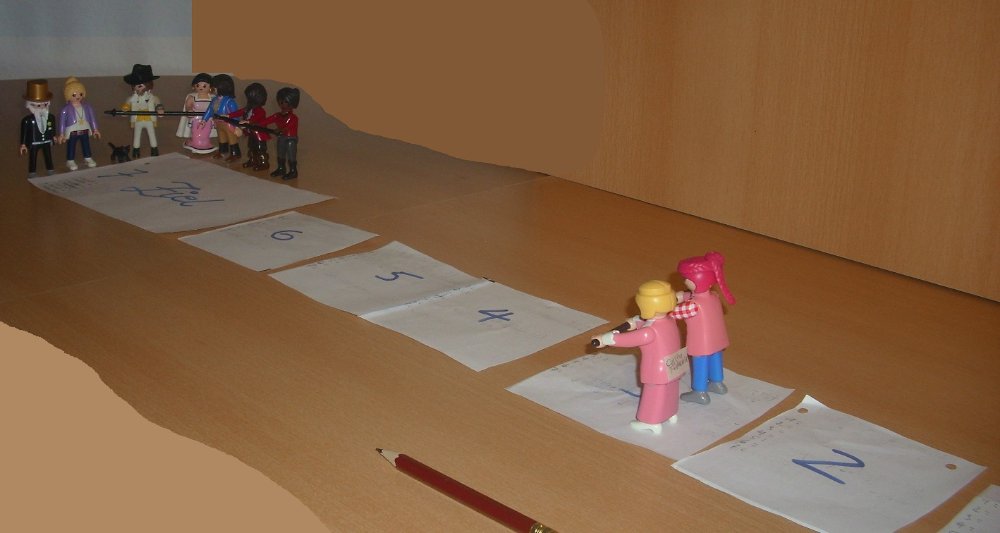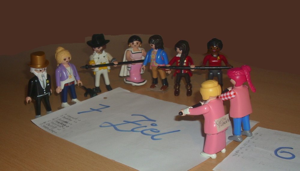 Petra würfelt eine 4 und fordert: „Feld 1 - wir warten noch auf ein Düll!