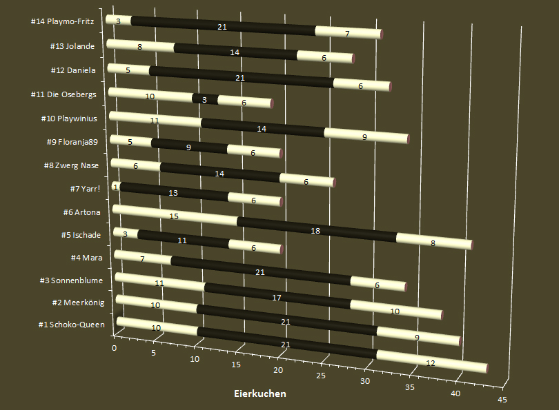Sonnenblume begann und gewann: Durchmarsch mit einer glatten 6! Gut, dass das keine Schulnoten sind ... Außerdem fragte sich Schoko-Queen: "Wer hat hier schon wieder Maschinenöl abgelassen?!"