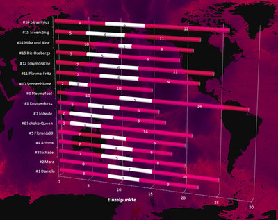 Den Anfang machte dieses Mal playmorache. Vom Hunger geplagt - gebt dem Armen doch endlich mal etwas zu essen - würfelte er eine 5. Von Feld 5 fiel er auf Feld 4 zurück (= 1 Extrapunkt). Mit einer 4 fuhr er in den Krater ein; mit einer 4 und einer 5 kam er wieder heraus (5 Extrapunkte). O-ton playmorache: "I'm stuck!" Flatterfees Erwiderung: "Siehst du das Licht über dir?" Das Ziel war mit einer 6 erreicht (insgesamt 6 Extrapunkte und das 1. 1/16 der Eiskugel). Sonnenblume folgte. Mit einer 4 ging es direkt an den Kraterrand. Uuund runter (Flatterfee) ging's ebenfalls einer 4. Rauf mit einer 6 und 3 (= 5 Extrapunkte). Eine 3 und Sonnenblume war im Ziel (2. 1/16 der Eiskugel)! Das Team Mika und Aine würfelte zuerst zwei 1en (= Feld 2). Von Feld 2 durften sie dann auf Feld 5 vorrücken, von wo auf Feld 4 zurückfielen (= 1 Extrapunkt). Mit einer 6 ging es ganz tief in den Krater hinab. Eine 5 und 6 später war das Team wieder am Tageslicht (= 5 Extrapunkte). Mit einer 4 war die Ziellinie erreicht (insgesamt 6 Extrapunkte und das 3. 1/16 der Eiskugel) Für Mara ging von Feld 2 auf Feld 5 (= Feld 4 + 1 Extrapunkt). Nach einer wirschaftliche 2, einer 4 und einer 2 (= 4 Extrapunkte) kam sie mit einer weiteren 4 ins Ziel (insgesamt 5 Extrapunkte und das 4. 1/16 der Eiskugel). Zwischenzeitlich stellte sich Knusperkeks die Frage: "Wer sitzt im Kühlhaus und puzzelt die einzelnen Stücke der Großen Eiskugel wieder zusammen?" Und Jolande konterte mit: "Die Kühlmaus!" Flatterfee lässt uns alle flattern, war die Devise des Abends (Daniela). Warum in die Tiefe schweifen ... Nach einem Umweg über die Felder 2 und 5 (= Feld 4 + 1 Extrapunkt) war Daniela mit einer 1 in des Krater gestiegen und kam mit einer 1 und einer 3 wieder. Eine 4 und auch sie checkte im Hotel ein (insgesamt 4 Extrapunkte und ein 5. 1/16 der Eiskugel). Für Knusperkeks ging gleich auf Feld 5 (= Feld 4 und 1 Extrapunkt). Mit einer 5 fuhr sie ein in den Krater. Eine 1 und eine 2 reichten nicht ganz und das 6. 1/16 der Eiskugel ging zunächst verloren). Mit vereinten Kräften konnte Knusperkeks schließlich geborgen und an's Ziel gebracht werden! Gut gelaunt ging's an die Bar, was Die Oserbergs zu folgendem Ausspruch hinreißen ließ: "Jawohl, so liebe ich euch: Schönes, dreckiges Gelächter!" "Be foolish! Throw!", ließ sich Playmofool von playmorache nicht zweimal sagen. Untief - mit einer 1 - ging es in den Schlund des Vulkans. Eine 6 und eine 4 und er ploppte wie ein Korken aus der Sektflasche (Zitat: Playmofool) aus dem Krater. Im Ziel hatte er ganze 9 Extrapunkte und das 7. 1/16 der Eiskugel. Für Die Osebergs zum Feld 3 und von dort nach dem Anlegen der Schutzkleidung auf Feld 4. Augen zu und rein mit einer 1. Raus die Maus mit einer 2 und 4 (= 4 Extrapunkte sowie das 8. 1/16 der Eiskugel). Schoko-Queen würfelte ebenfalls den Umweg über die Felde 2 und 5 (= 1 Extrapunkt). Mit einer 4 ging's hinein mit zwei 6en wieder rasant nach oben (= 8 Extrapunkte). Im Ziel zählte sie 9 Extrapunkte und war im Besitz des 9. 1/16 der Eiskugel. Für den Meerkönig würfelt John Wayne eine 3 (= Feld 4) Eine 1, eine 4 und eine 2 und er hatte nicht nur 5 Extrapunkte, sondern auch das 10. 1/16 der Eiskugel. Mit einer 1 fiel er von Feld 5 auf das Feld 4 zurück (= 1 Extrapunkt). Wieder ging es in den Krater hinein (mit einer 5). Zwei 4en später war auch Knusperkeks' 1/16 der Eiskugel geborgen (= 3 Extrapunkte). Damit kam John Wayne für Meerkönig auf insgesamt 9 Extrapunkte und einmalig zwei 1/16 der Eiskugel. Artona würfelte eine 5, um auf Feld 4 zu gelangen (= 1 Extrapunkt). Mit einer 3 stieg auch sie in die Unterwelt hinab. Mit einer 1 und einer 3 erhielt sie 1 weiteren Extrapunkt, sowie das 11. 1/16 der Eiskugel. Eine 1 ließ sie erneut auf Feld 4 zurückfallen (1 Extrapunkt). Diesmal blieb es jedoch nur bei einem Versuch. An der Hotelbar in Ushuaia wurde sie (insgesamt 3 Extrapunkte) schon freudig erwartet ... Ischade gelangte über Feld 3 auf Feld 4. Dann kletterte sie mit einer 5 tief hinab in den Monte Burney ... Eine 2 und eine 6 brachten ihr nicht nur das 12. 1/16 der Eiskugel, sondern auch insgesamt 3 Extrapunkte ein. Mit einer 5 ging's an die Wunder-Bar. Floranja89 macht es wie viele: Sie würfelte eine 2 und erreichte über Feld 5 das Feld 4 (1 Extrapunkt). Eine 1 und es hieß auch für sie: "Monte, burn me!" Eine 4 und eine 2 und sie war wieder da (= 5 Extrapunkte). Eine 5 und dann kam: "Die Büffel stehen an der Bar, an der Bar, an der Bar, warum steh'n die da?" (insgesamt 6 Extrapunkte und das 13. 1/16 der Eiskugel). "Go, Jo!", rief Flatterfee Jolande nun auf. Feld 2, Feld 5 und Feld 4 war die Reihenfolge (= 1 Extrapunkt). Weitere 2 Extrapunkte gab es für zwei 5en und eine 2. Ushuaia war mit einer 6 erreicht. Jolande hatte das 14. 1/16 der Eiskugel und 3 Extrapunkte geholt. Als Vorletzter würfelte erwinius für das Team playwinius: Über Feld 3 ging's zu Feld 4. Mit der 1 ging's hinab ins Auge des Vulkans. Nach einer 2 und einer 6 machte es so etwas von PLOPP - von Schweizer Präzision wurde gesprochen (7 Extrapunkte und das 15. 1/16 der Eiskugel). Playmo-Fritz wurde auf Feld 5 gewürfelt (= Feld 4 und 1 Extrapunkt). Eine 4, eine 3 und eine 4 brachten ihm 3 Extrapunkte und das 16. und letzte 1/16 der Eiskugel ein. Abschließend mit einer 2 erfolgte Fritz' Punktlandung im Ziel.
