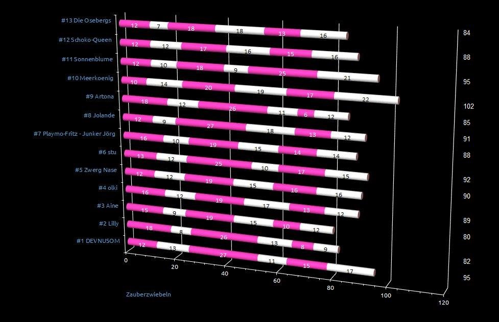 Da habe ich bei der Sonnenblume nicht richtig summiert, sie hat nicht 92, sondern 102 Zauberzwiebeln und führt zur Halbzeit deutlich mit 7 Zauberzwiebeln.