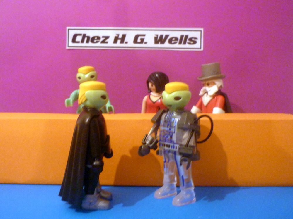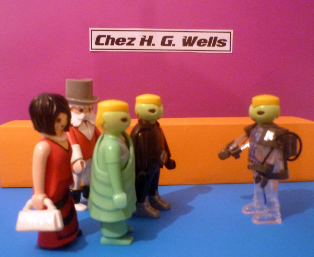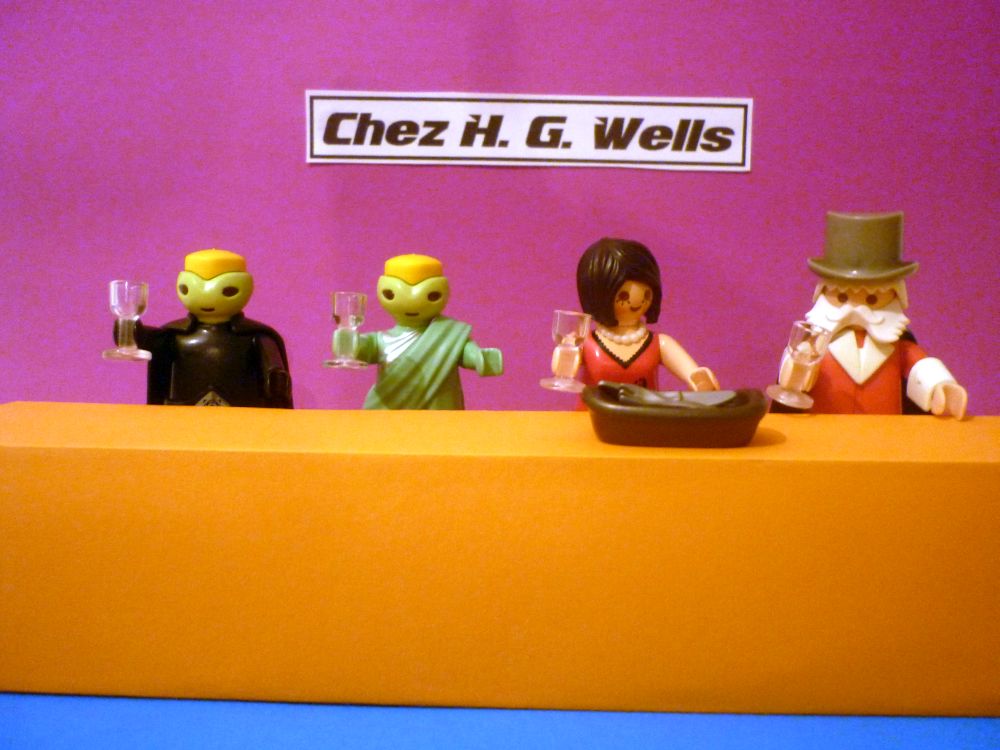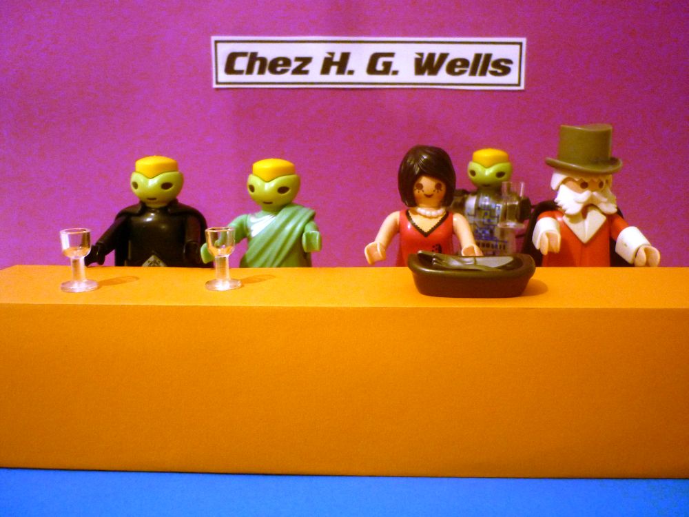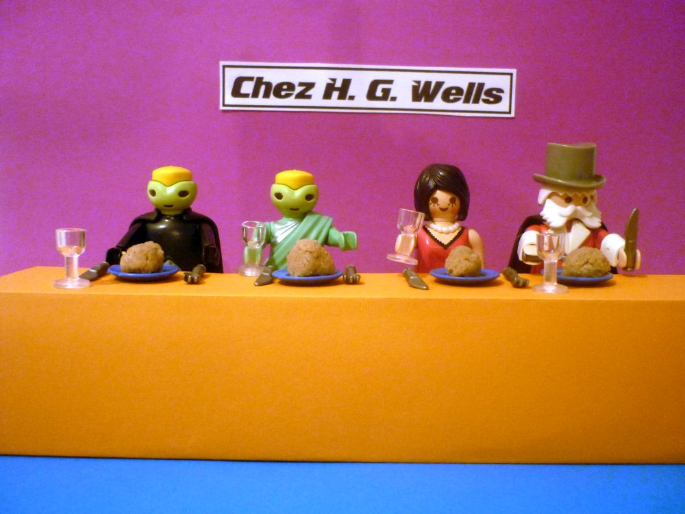Gespannt folgten Frau Dr. Weiß und unser Eusebius ihren neuen Freunden in das Restaurant CHEZ H. G. WELLS. Neugierig waren unsere Helden was sie dort wohl erwartet! Wie sieht ein Lokal im Jahre 2222 aus? Wie schmeckt das Essen in dieser Zeit?