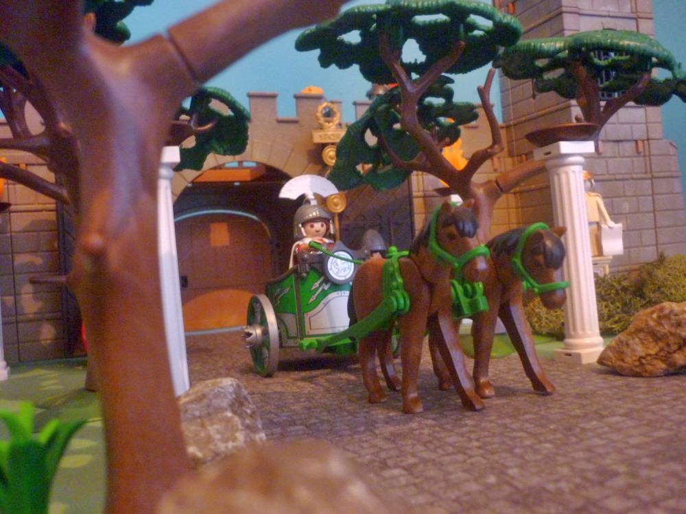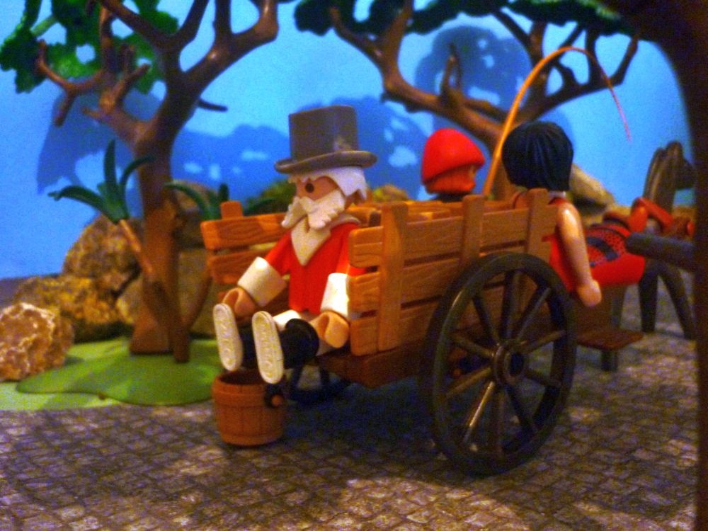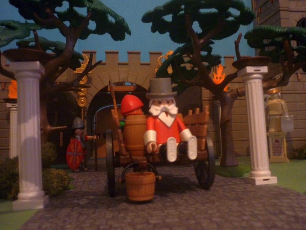 "Nein ich bringe die Fässer zur Garnison Stedumrum, der Kommandant trinkt meinen Wein fässerweise. Wenn ich nicht pünktlich dort erscheine, wirft er mich den Löwen in der Arena in Rom zum Fraße vor, er ist ein ganz harter Brocken! Aber steigt auf, dann könnt ihr bis Stedumrum mit mir mitfahren! Dort fragt einfach nach dem Weg nach Rom!"