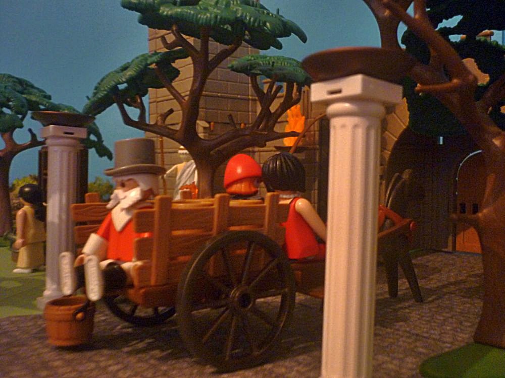 Nach einer holprigen Fahrt auf der Landstraße kommt das Fuhrwerk samt Frau Weiß und Dr. Eusebius an der Stadtmauer an.