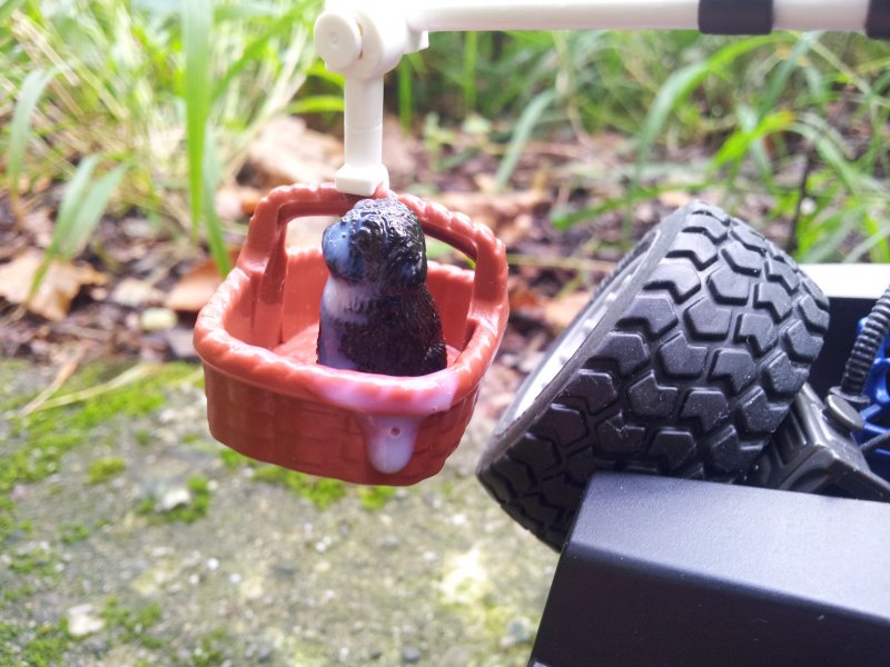 Schnell wird der Greifarm ausgefahren und der Korb befestigt.