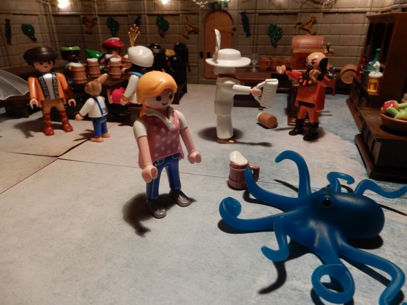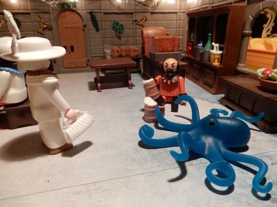 Erschrocken springt der Barkeeper auf. Die Datenkrake bringt sich vorsichtshalber in Sicherheit.