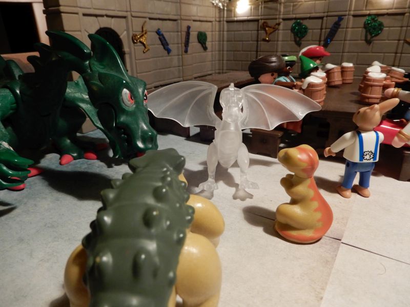 Fridolin und Burny unterbrechen ihr Spiel ("wer kann besser Feuer oder Eis spucken") und begrüßen Sai und Trüffel.