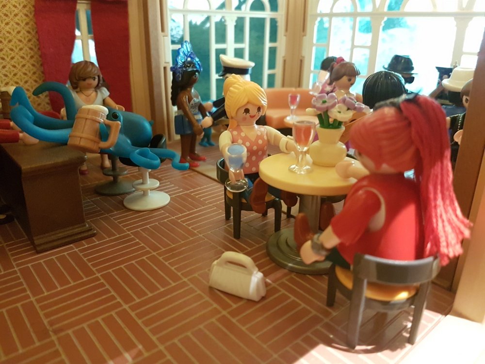Erwiniuns: "Nun, der wäre in dieser Zeit schon sehr auffällig. Aber zur Sicherheit habe ich ihn natürlich dabei. Bei Kraki weiß man schließlich nie, wo man landet..." Wir setzten uns an die Bar und bestellen uns Drinks. Mara schlendert unterdessen zu Playmolook und Sonnenblume hinüber.