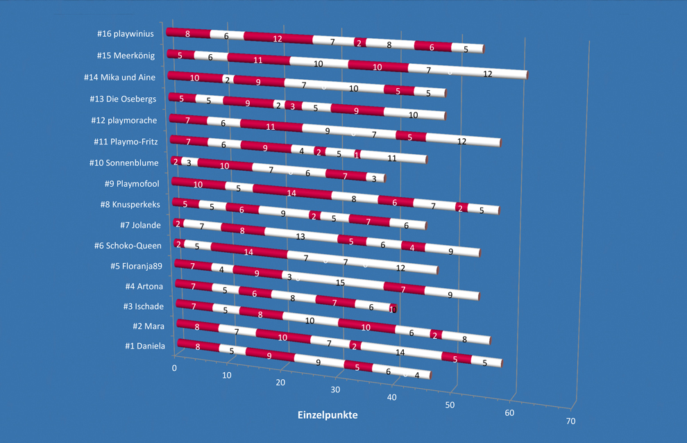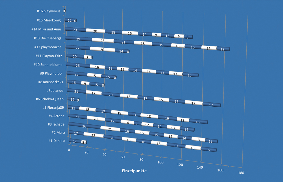 - Platz 3 teilen sich Playmofool und playmorache mit jeweils 57 Punkten.