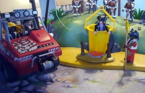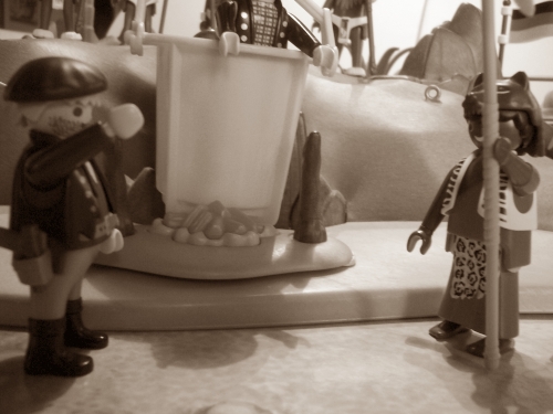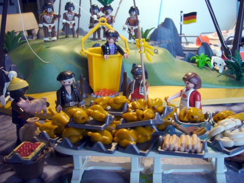 (Nix da mit Hunger! Da, schau mal: ich habe euch von meinem Stamm der Caterer etwas Gutes mitgebracht. Guckt dir das mal an!)