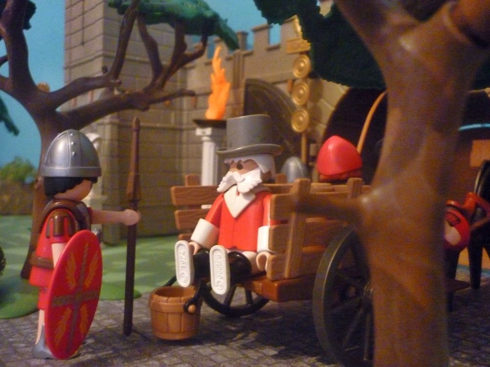 von zwei Fremden aus der Zukunft, die kommen werden um den magischen metallenen Teil abzuholen, welcher von einer meiner Legionen auf einem Feld gefunden wurde. Seit diesem Tage an, brachte uns dieser Teil nur Unglück und laut unserem Seher Blindikus hält diese Unglückssträhne so lange an, bis zwei Fremde in einer Art Zeitfuhrwerk diese abholen und zurück zur Göttin URANIA bringen! Sie reisen doch mit einer Art Zeitfuhrwerk, stimmt das!