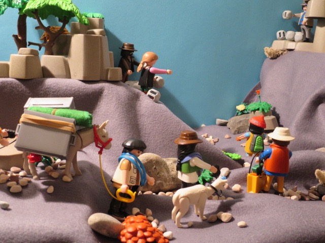 Die Kerle sprangen von den Felsen zu uns in die Schlucht. Aber wieder hatten sie unseren tapferen Alpakas unterschätzt.