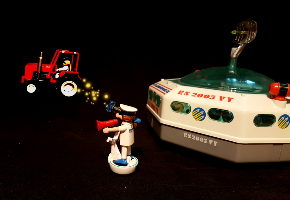 Mit Hilfe irgendwelcher Strahlen koppelt er unser Ufo hinten an den Traktor ab und dann geht es ab. Ob wir allerdings auf diese Art schneller sind, das bezweifle ich jetzt doch ein wenig.