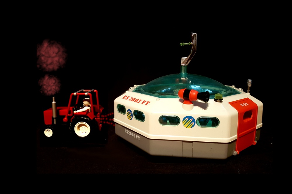Roland richtet eine Strahlenpistole ins All und da manifestiert sich tatsächlich ein knallroter Traktor.