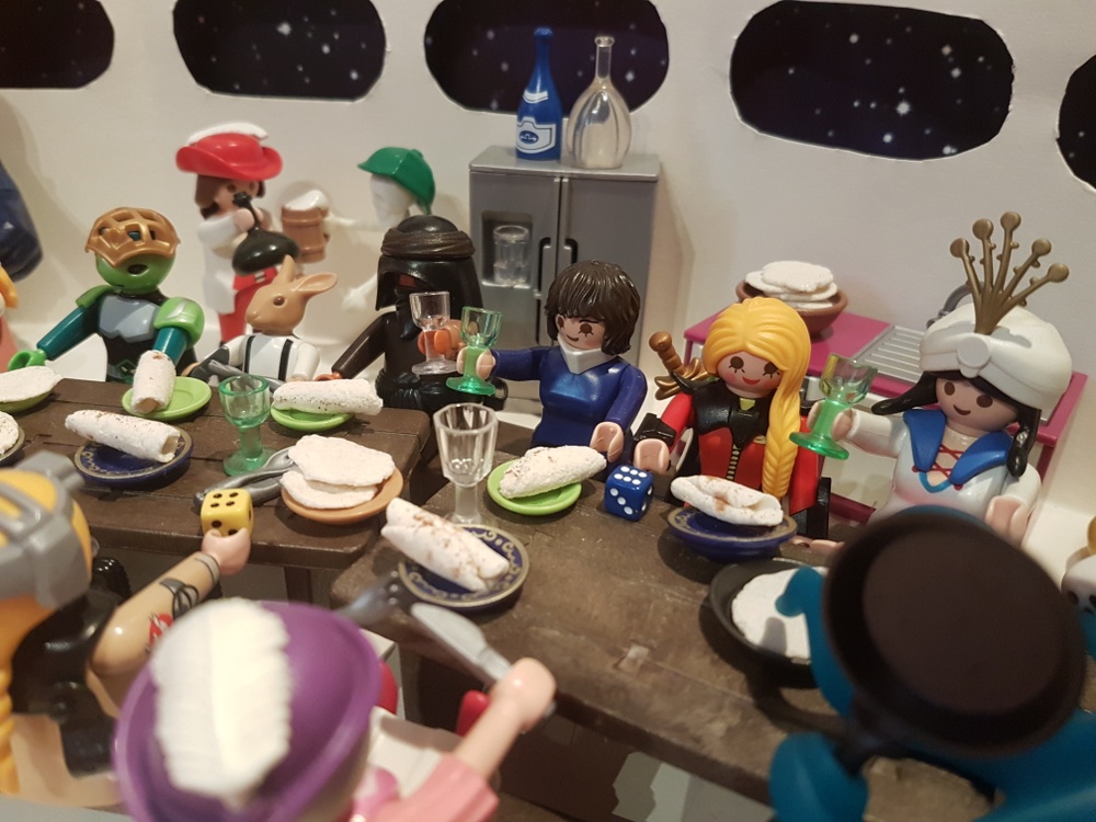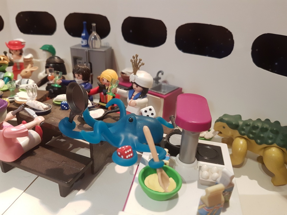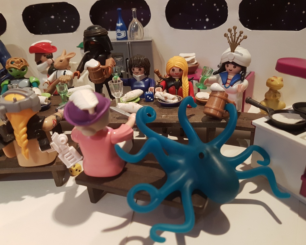 Don Kichoti ist wieder mit seinem Traktor unterwegs, Ufos abschleppen, Darß Locher bespitzeln oder was auch immer so ein Kliki Ritter tut. Auch Flatterfee fehlt heute, so dass Kraki heute sowohl den Küchendienst als auch die Spielleitung ganz alleine übernehmen muss. Und Kraki macht das toll! Er rührt den Teig an, hantiert mit drei Pfannen gleichzeitig, erklärt die Regeln des heutige Würfelspiels, würfelt und notiert die Würfe der einzelnen Teams. Das läuft dermaßen gut, dass jedes Team noch 5 Eierkuchen extra erhält. Schon toll, wenn man 8 Arme hat!