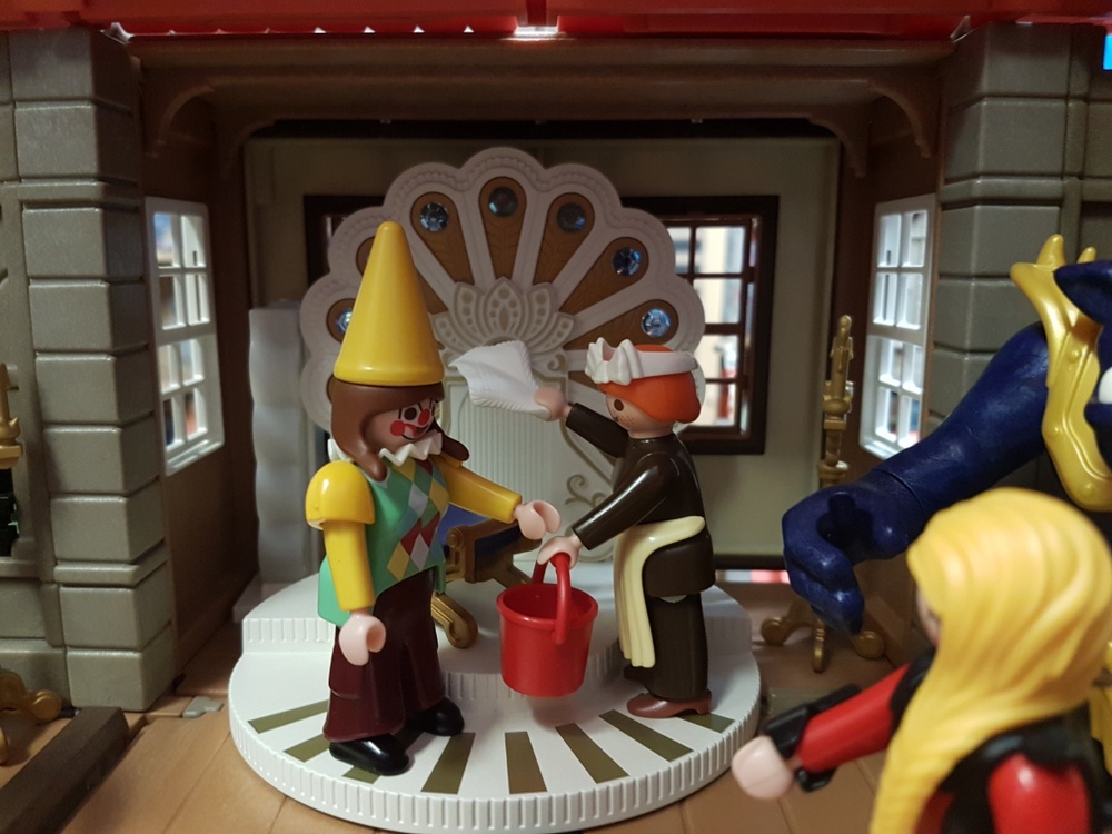 Die Närrin schnappt sich den Eimer des Dienstmädchens, lässt ihn einige Male am ausgestreckten Arm kreisen und stoppt ihn dann abrupt über ihrem Kopf. Platsch - klatscht das ganze Wischwasser über die Närrin und auf den Boden.
