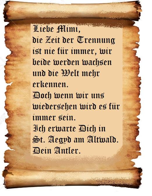 Dort wird der Antler bereits von mir erwartet. "Aus Feuer wird Wasser", spricht er und bietet mir die Flammen dar. "Ich gebe es Mimi, die ich zu meiner Gefährtin gewählt habe." Es herrscht angespannte Stille.