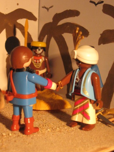 Ich beschloss mir die kleine Insel, auf der unser Schiff lag, mal genauer anzuschauen. Da entdeckte ich glücklicherweise einen Fährmann. Ich bat ihn freundlichst darum mir zu helfen, doch er wollte nicht. "Erst Winterschlaf, dann Hilfe!", sagte er immer wieder. 'Mist, so ne Siesta dauert ewig. Bis der wieder auf ist, haben wir Frühling', dachte ich mir. Also ging ich zu meiner Mannschaft und teilte ihnen mit:"Sorry Leute, aber der Fährman hält erstmal Winterschlaf, und dann kann er uns erts rüberbringen."