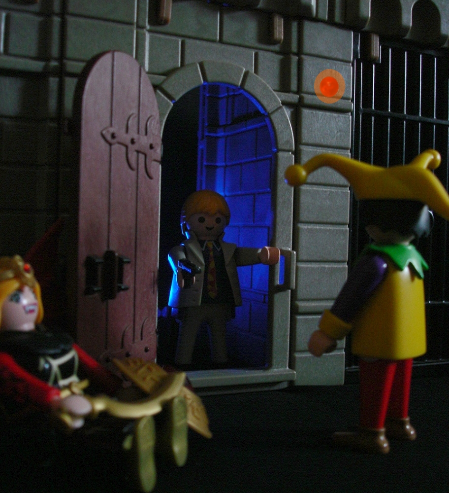 Dann geht alles rasend schnell. Die Tür wird aufgestoßen "AUA!" und ein Windhauch löscht alle Fackeln aus "HUCH!". John Sinclair: "Guten Abend und schön die Beißerchen stillhalten,