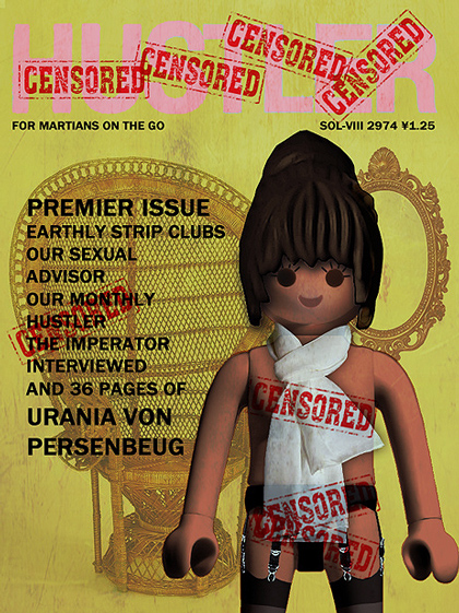 Zurück auf der Erde hatte Flynt sofort Kontakt zu Nosie aufgenommen und ihr alles haarklein erzählt, wie es Urania seither auf dem Mars ergangen war. Ja, man staune: Die Marsianer verschonten auch die Leben von Flynt und seines Fotografen. Sie hatten sich verdient gemacht – auch wenn die Marsianer nicht so ganz das Prinzip verstanden hatten. Für gewöhnlich wechselten die centerfolds monatlich. Nicht so auf dem Mars! Dort sollte es nur ein einziges centerfold geben! Lediglich die locations der shootings sollten monatlich wechseln. Und der Kröterich? Der hatte den richtigen Riecher besessen: Die Bilder von Urania in den Mars-Sonderausgaben des HUSTLER schlugen ein wie eine Bombe! NAG! NAG! NAG! Ein jeder wollte Urania sehen und die Printmedien auf dem Mars kamen gar nicht mehr hinterher mit dem Drucken. In einem ersten Schritt war Urania also ein centerfold geworden. Aber es ging noch weiter, denn der hype hatte gerade erst begonnen.