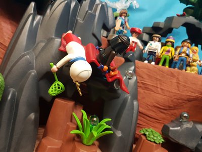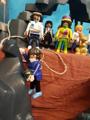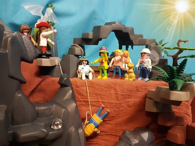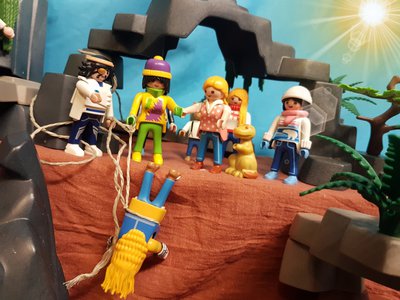 Irgendjemand hatte zum Glück ein Bergseil im Gepäck. Jenny Sunflower erklärt, sie hätte in ihrer Ausbildung bei der NASA mal einen Kurs im Bergsteigen gemacht. Daher macht sie den Anfang und zeigt uns, wie man am Besten in den Krater absteigt.