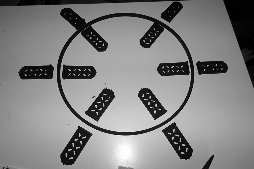 Darunter kommt u. a. ein schwarzer Kranz [eine erste Stellprobe ohne Kabel etc.].