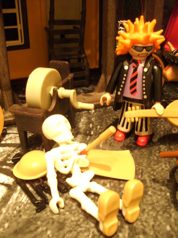 Rocker: „Whauw, was für ein Schreck, ich dachte schon…, aber es ist nur ein Vampir. Super cool von euch…, meine Karre wird jetzt wohl nicht mehr repariert, kann ich mit euch mitfahren? Ich kann vielleicht auch etwas für euch machen? Ich wollte zur Burg Gallstein, ich spiele da auf der mega großen Geburtztagsparty. “