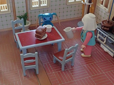 den sie mit heißer Schokolade und Kuchen verwöhnt.