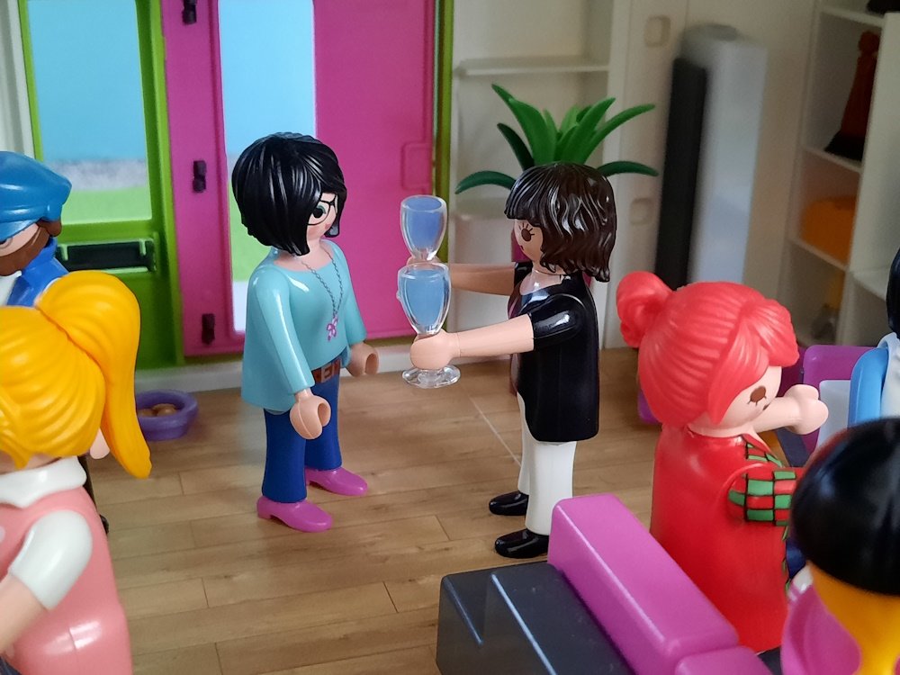 "Hallo Playmolook! Nein, die Party ist in vollem Gang. Komm rein!", entgegnet Sonnenblume.