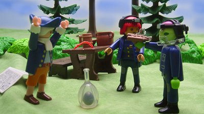 Plötzlich erscheint über der Flasche das Hologramm eines weiteren Außerirdischen. Er scheint sich mit jemandem im Hintergrund zu unterhalten und hat Vauban den Rücken zugekehrt. “Meine umfangreichen Studien dieser niederen Lebensformen hat ergeben, dass die Flaschenpost ein gängiges Kommunikationsmittel auf dieser Welt ist. Jetzt schweigt, ich habe zu tun.” Dann dreht der Außerirdische sich nach vorne und der halslose Kopf blickt auf Vauban. “Ich grüße dich, primitive Lebensform. Der Rat der Zwölf hat von eurem Rennen durch die Galaxis erfahren und beschlossen, daran als Sieger teilzunehmen. Zur Vereinfachung der Kommunikation über unseren Sieg sollst du uns dabei unterstützen.” Aufgrund seiner Herkunft sieht Vauban sich in der Lage, all die Fragen, die auf ihn einstürmen, mit eloquenter Genauigkeit auf einen Punkt zu bringen. “HÄH??”