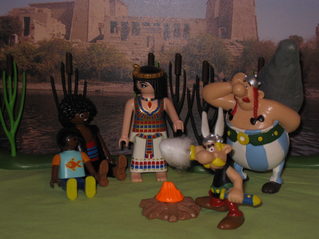 Wenig später sitzen alle zusammen am Flußufer um ein üppiges Picknick herum. Ramon und Usi lernen Axterix und Hobelix kennen. Die beiden französischen Architekten haben Sinfonatras Schwester Kleopatra vor einigen Jahren beim Bau ihres Ferienhauses geholfen und kommen seitdem regelmäßig in den Osterferien zu Besuch. Schnell hat Axterix ein Lagerfeuer entzündet und röstet Marshmellows für Usi.