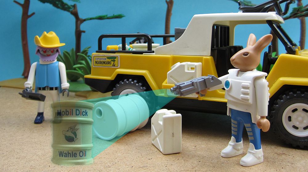 „Aber wie kommen wir dahin? Zu Fuß etwa? In diesem Falle wäre ich zum ersten Mal auf Sie neidisch.“ Dr. Zee starrte auf To Bies muskulöse Oberschenkel, die sich durch die dünne Uniform gut abzeichneten. „Wirklich zum ersten Mal? Sei es drum, ich habe im Tesseraktspeicher meines Multitrons etwas sehr interessantes entdeckt. Ich kann mich zwar nicht daran erinnern, es selbst eingelagert zu haben, aber die chemische Zusammensetzung sollte den antiken Motor sehr wohl zum Laufen bringen.“ Der Lampdanoide tippte mit flinken Fingern einen Code ein, und ein Fass mit Original-Ähterwal-Auswurf materialisierte. „Dieser Treibstoff sollte uns mehr als zweimal um den gesamten Planeten bringen.“ „Ich wünschte vielmehr, dass er uns von dem Planeten wegbringen würde“, murrte Zee.