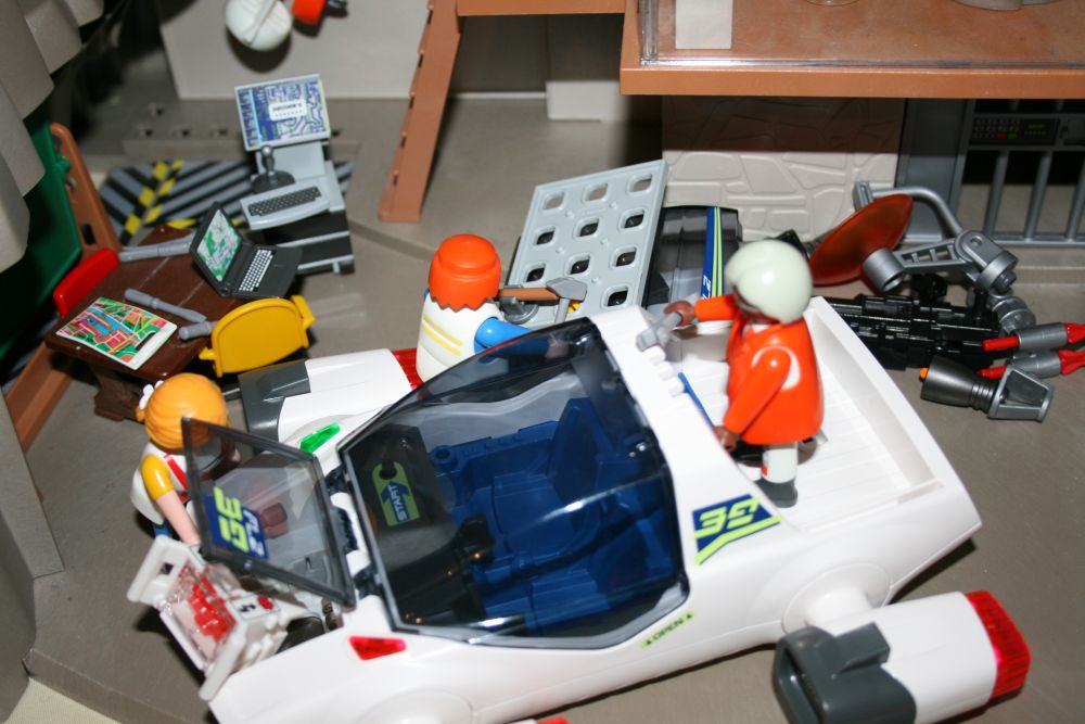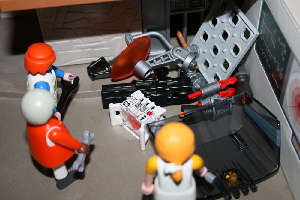 viele erfolglose Versuche später standen unsere drei Bastler fix und fertig vor einem viel kleineren Haufen Teile in dem unter anderem ein merkwürdiger Kristall lag, sie schauten den Kristall an, schauten sich an und hatten alle drei die selbe Idee.