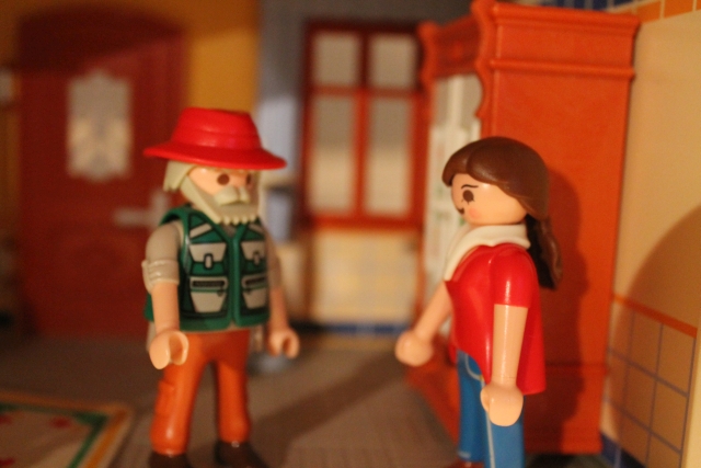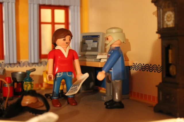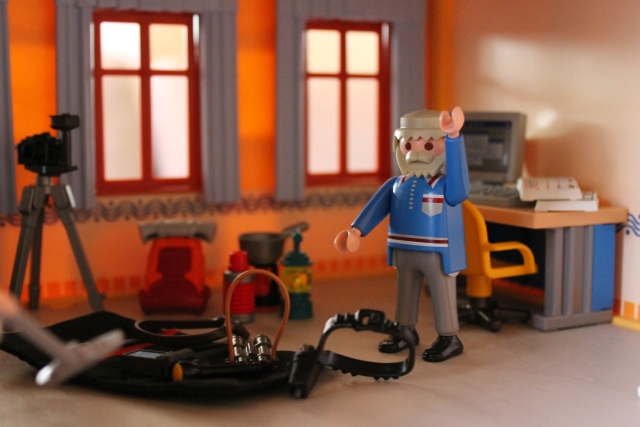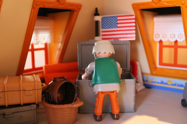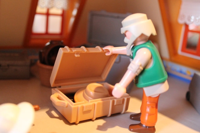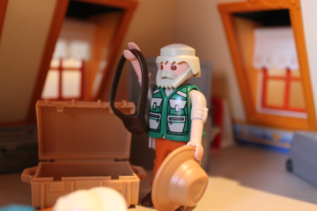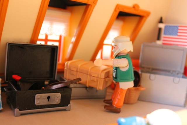 Und so geht das noch ein Weilchen bis er alles zusammengefunden hat. Am nächsten Morgen, nach dem Frühstück, trägt er alles im Arbeitszimmer zusammen und hakt seine Gepäckliste ab.