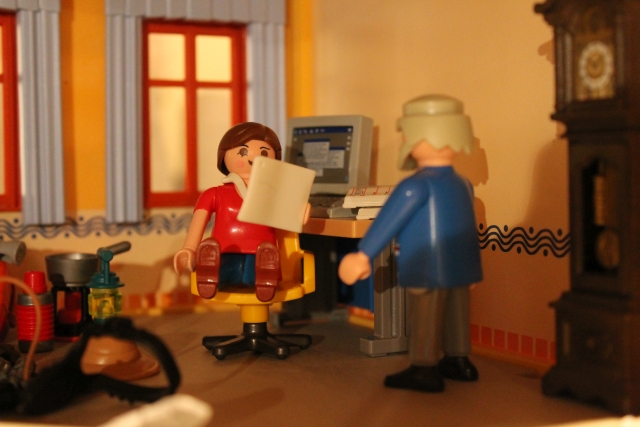 Die Frau Doktor ruft mit dem Sprechgerät nach ihrer Arzthelferin und bittet sie das "Südamerika-Paket" mitzubringen.