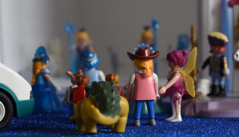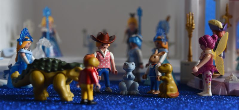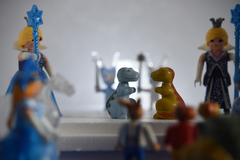 "Wieso bist du nicht blau?" entgegnet der blaue Dino.