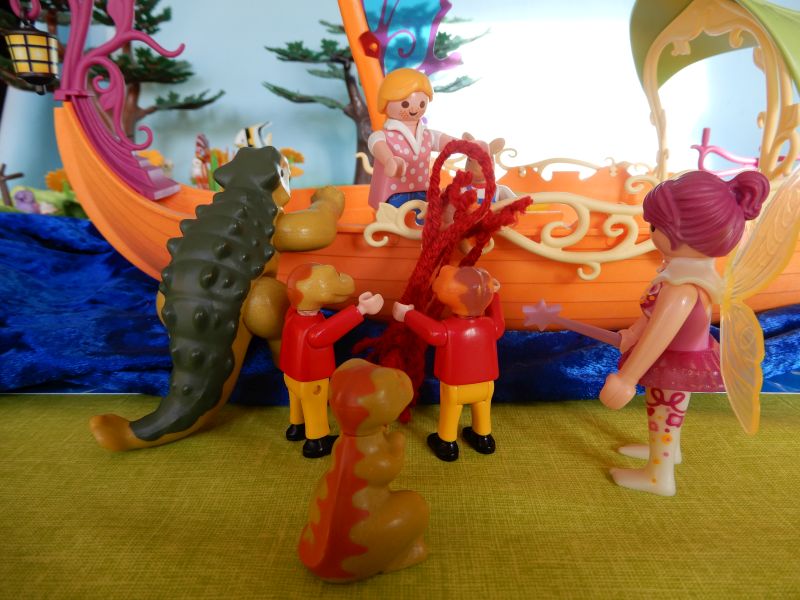 "Aber sicher! Da ist das Sonnensegel, hinten das Ruder. Positionslampen sind auch vorhanden - fertig!" erklärt die Fee. "Die weitere Ausrüstung ist in der Kiste, das kennt ihr ja schon: Mohrrüben, Schlafsäcke und was ihr sonst noch so braucht."