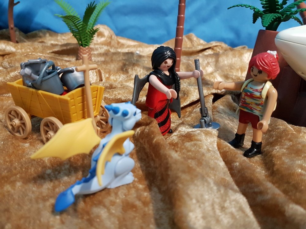 Artona: "Hallo Flatter! Was machst du denn da? Machst du jetzt einen Schrotthandel auf? Als ihr uns zur Schatzsuche aufgefordert habt, dachte ich eigentlich an Gold und Perlen und nicht an verbeulte Blecheimer!"