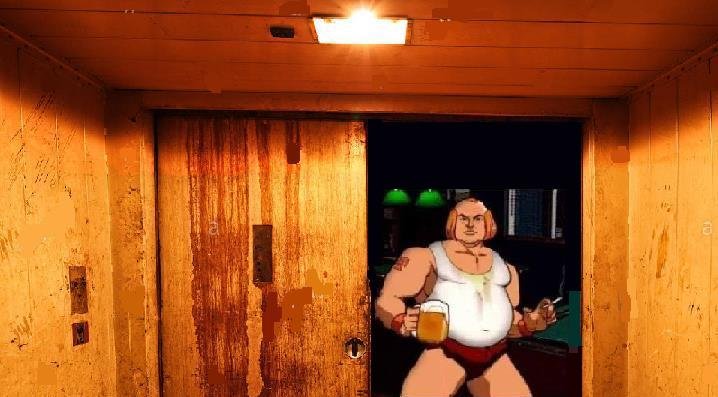 Ein dickbäuchiger Kerl öffnet die Tür mit der Kippe und einem Bierkrug in der Hand und fragt leicht lallend: "Wat willste denn scho wieda, Orko? Isch hab kene Zeit für Dene albernen Heldentaten. Und wat is dat denn für 'ne Blechkiste?"